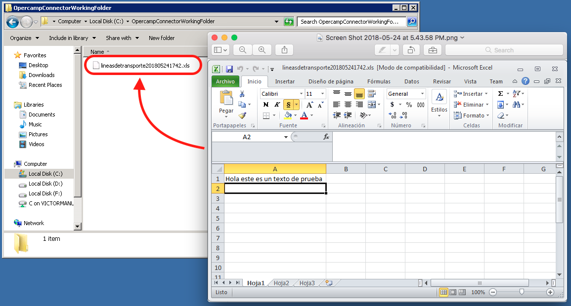 El siguiente paso es hacer una prueba de transmisión de datos hacia OperCamp. Para esto vamos a crear un archivo de MS Excel (con extensión .xls, es decir un libro de excel 97 – 2003) con el nombre de «lineasdetransporte201805241742.xls» y lo colocaremos en nuestra carpeta o directorio de trabajo: