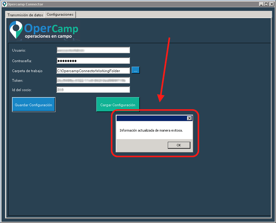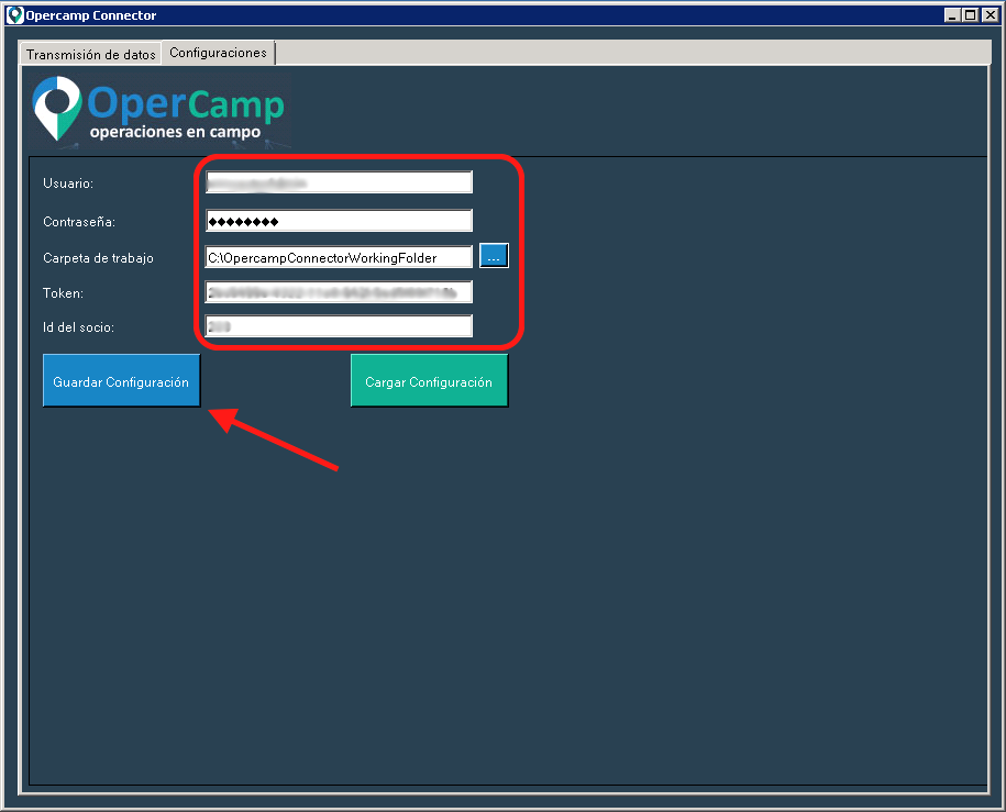Da click en la pestaña «Configuraciones«. En esta escribe los datos que te proporcionamos (usuario, contraseña, token y Id del socio) dependiendo del ambiente en donde estés instalando el conector. Si no cuentas con estos datos, favor de contactarnos al correo soporte@opercamp.com: