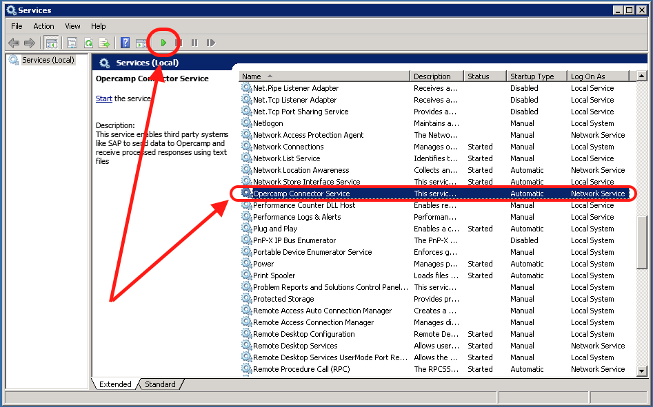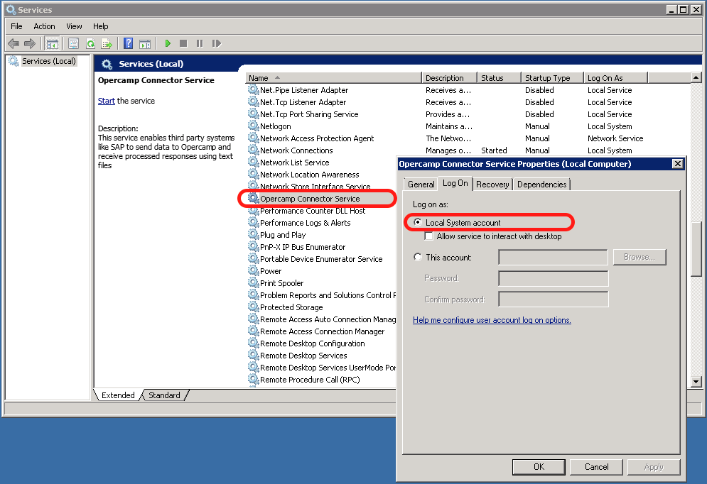 Cierra el OperCamp Windows Form y abre el administrador de servicios de Windows en tu servidor. Localiza el servicio con el nombre «Opercamp Connector Service» y ajusta la cuenta que utilizará para su ejecución a «Local System«:
