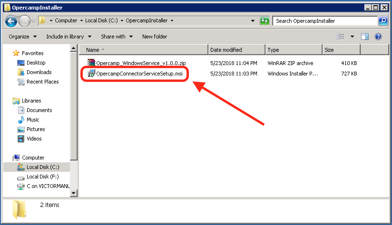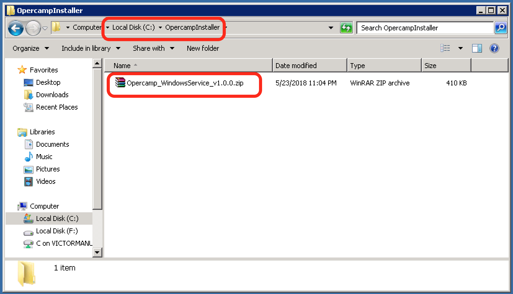 Descarga el Opercamp Windows Service (desde el enlace de arriba) y guardalo en un directorio dentro del servidor en donde realizarás las instalación. Se recomienda que uses un directorio bajo la unidad del drive local (por ejemplo «C:/«). En este caso vamos a usar un directorio con el nombre «OpercampInstaller«: