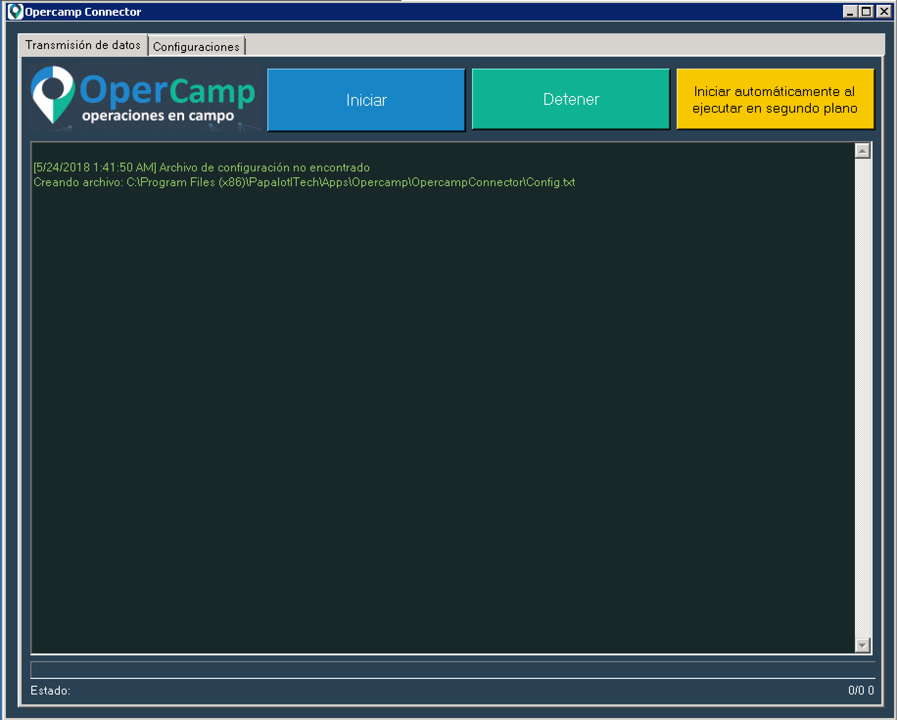 Ahora necesitamos ejecutar manualmente el Opercamp Windows Form para completar el resto de las configuraciones haciendo doble click en el archivo «OperCampConnector.exe«. Se abrirá la siguiente pantalla: