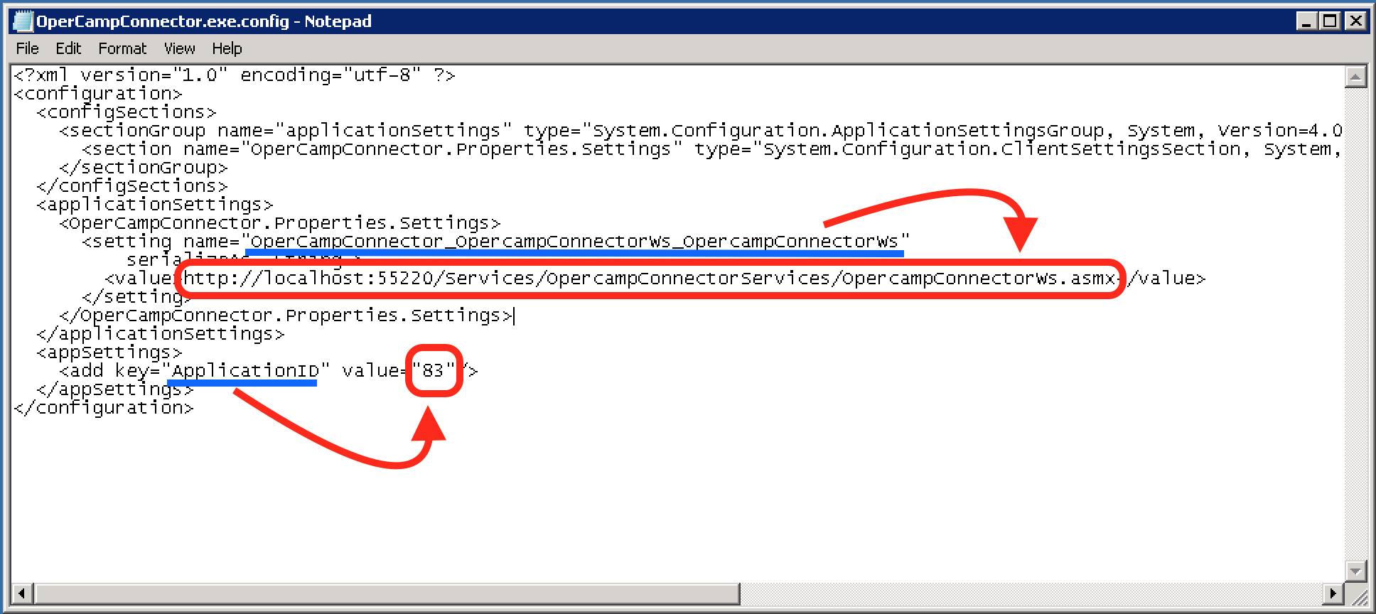 Usando un editor de texto, ábrelo y localiza los keys: «OperCampConnector_OpercampConnectorWs_OpercampConnectorWs» y «ApplicationID«. Los valores de dichos keys deberás de ajustarlos dependiendo del ambiente de ejecución (pruebas o producción):