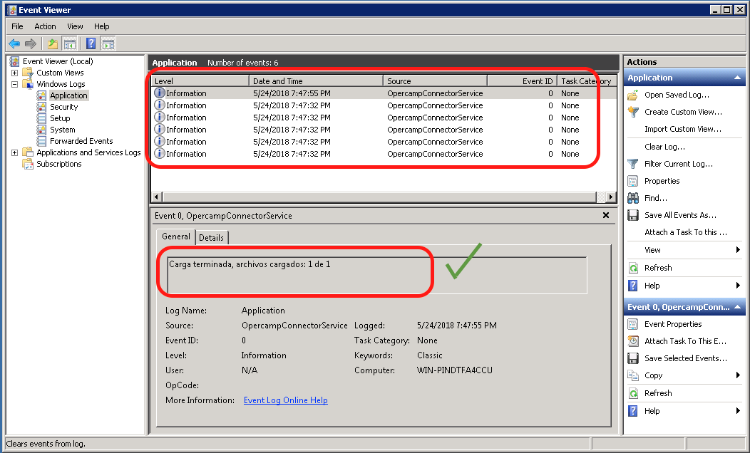 Finalmente tienes que verificar los mensajes del conector en el Event Viewer de tu servidor. Localiza aquellos de la fuente «OpercampConnectorService«. Si todo está funcionando correctamente solo verás del tipo «Information«: