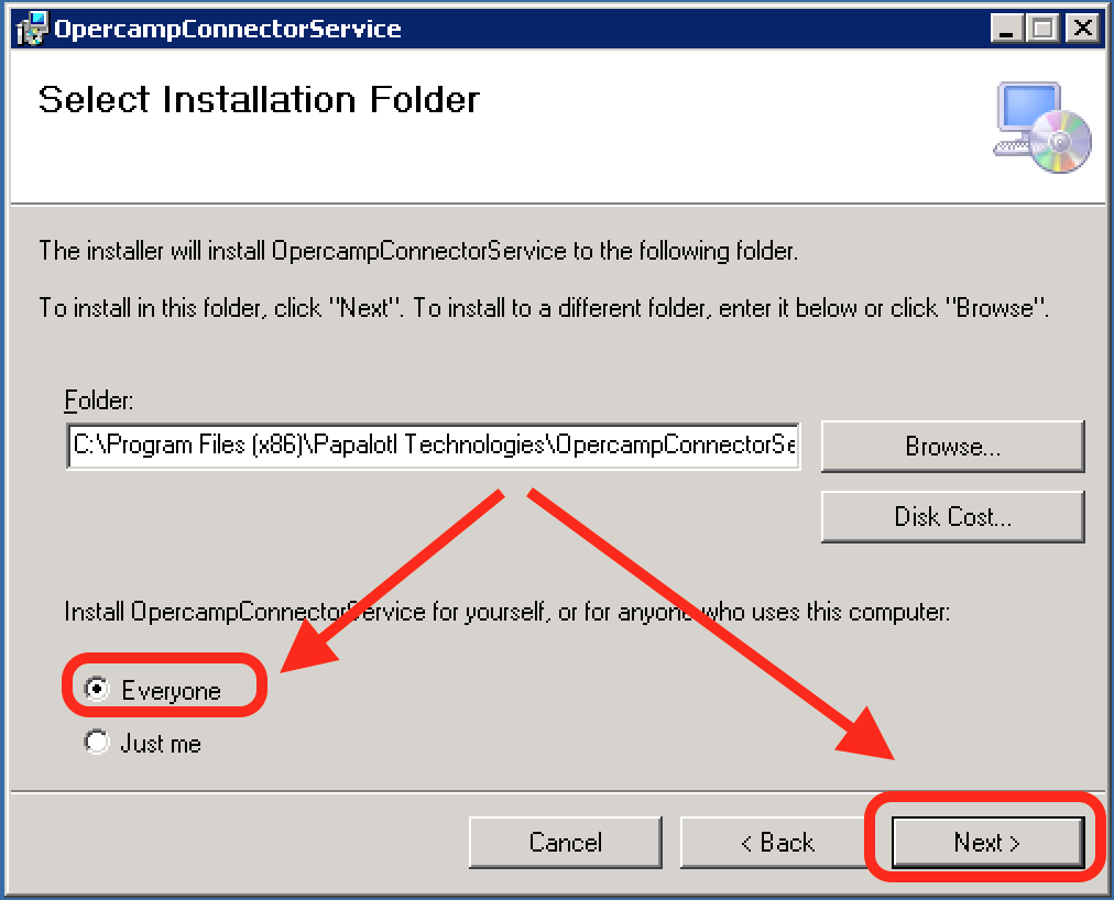 En la siguiente pantalla se mostrará la ruta por default en donde se instalará el servicio. Puedes cambiarla, pero recomendamos que uses esta. Dicha ruta es «C:\Program Files (x86)\Papalotl Technologies\OpercampConnectorService\«. También deberás de seleccionar la opción «Everyone» y presionar el botón «Next«: