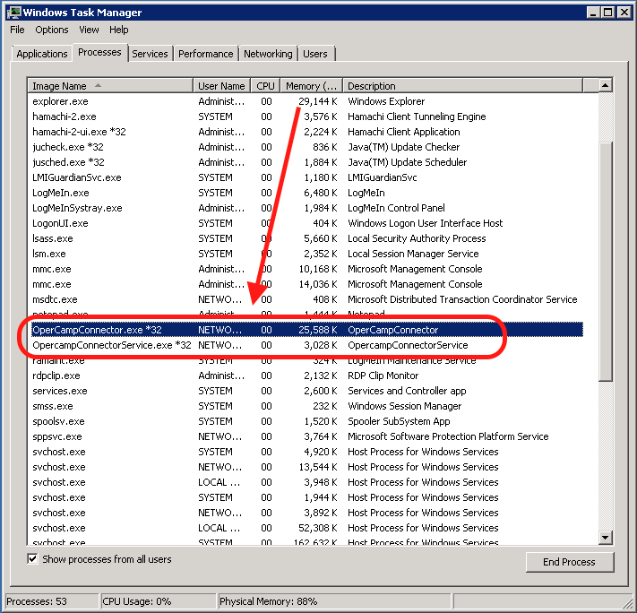 Para comprobar que el conector ha iniciado en backgroud, abre el Task Manager de tu servidor y localiza los procesos «OperCampConnector.exe» y «OperCampConnectorService.exe«. Deberán de aparecer aquí para asegurar que están en ejecución: