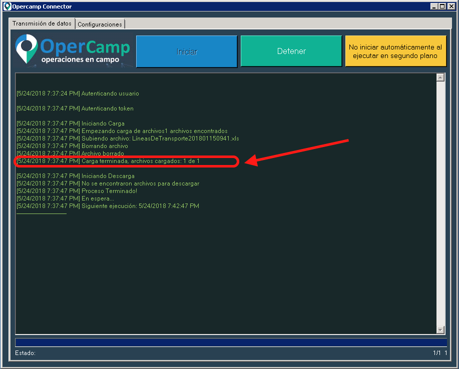Ahora, solo presionaremos el botón «Iniciar» y deberíamos de ver un mensaje con el texto «Carga terminada, archivos cargados: 1 de 1«: